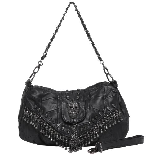 A bold, edgy and stylish satchel purse with giant 3D skull ornament and gunmetal skull-shaped studs. I love the sparkling fringe of metal chain with cool looking faceted faux gemstones placed around the quilted smooth leather exterior finish. Check it out, and add it to your wardrobe accessories.